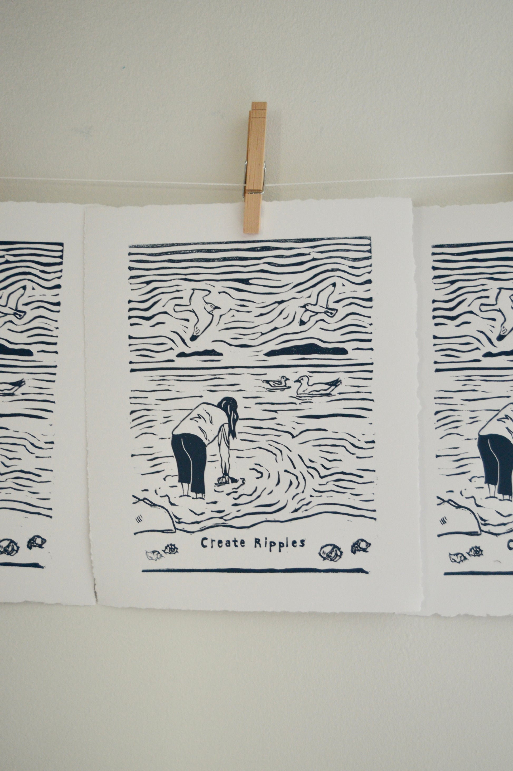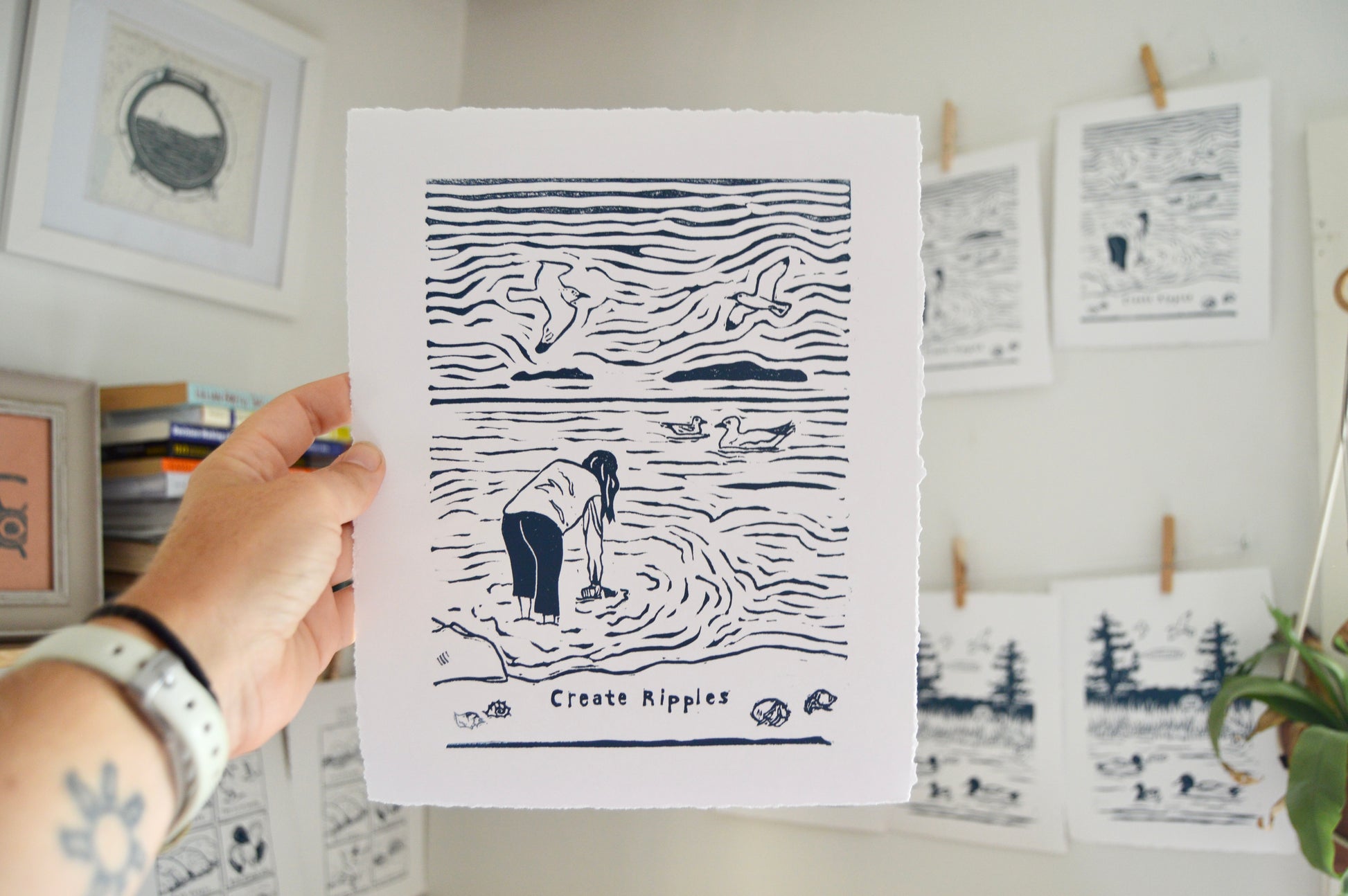 This print is an original design made fully by hand (by me!). I sketched and then carved the design out of a linoleum block and then pressed it like a stamp onto the paper.