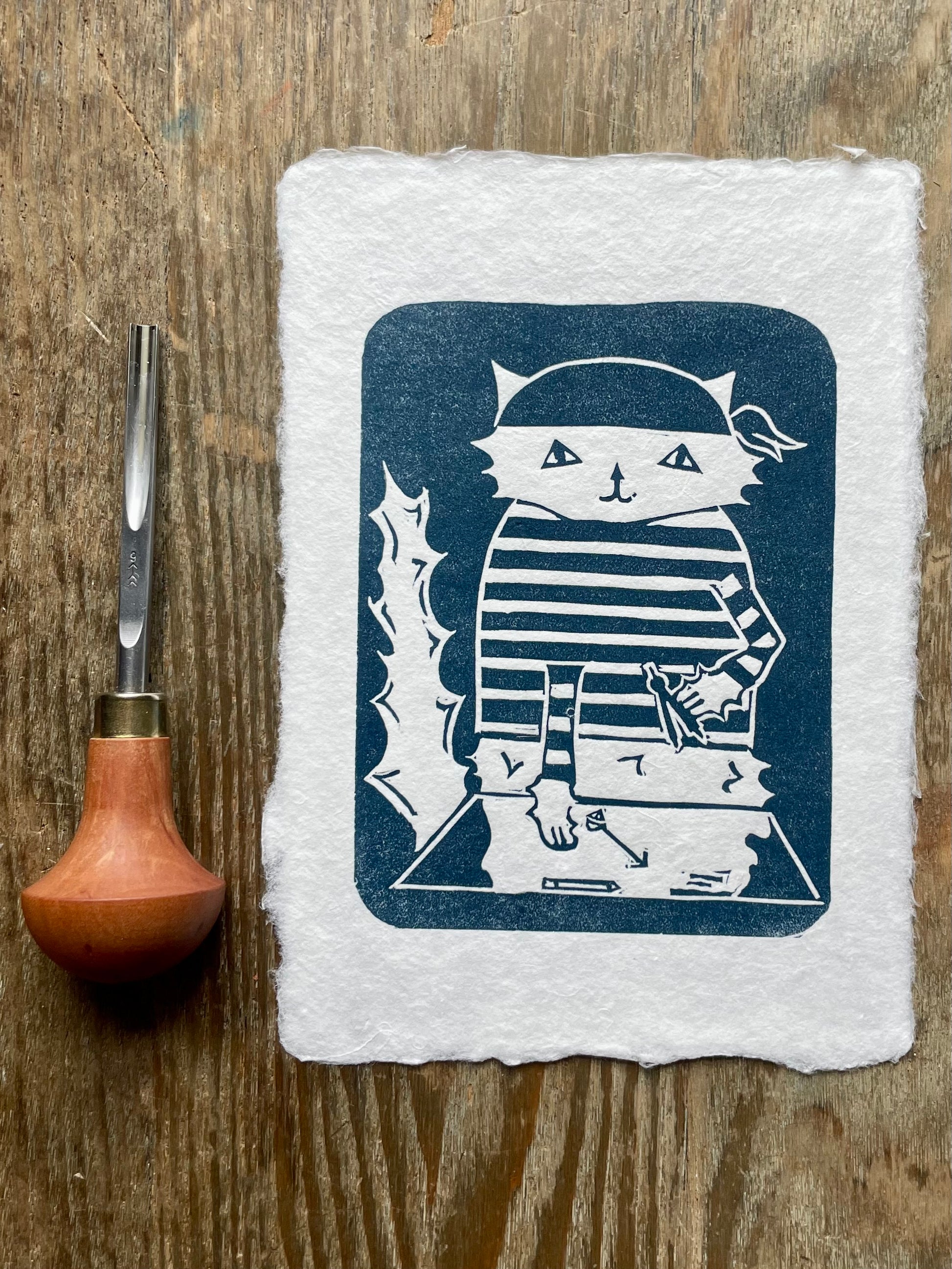 First Mate Roger!! This print is inspired by my cat (Roger). It is an original design, hand printed by me. The dimensions are roughly 5x7, but the paper is also handmade so the sizing varies (only slightly). This fun print is the perfect addition to your home, whether you’re a cat lover, a boat lover, or just enjoy humorous beautiful art. Because I print everything by hand there may be slight differences between each print, and that is part of the beauty of printmaking!