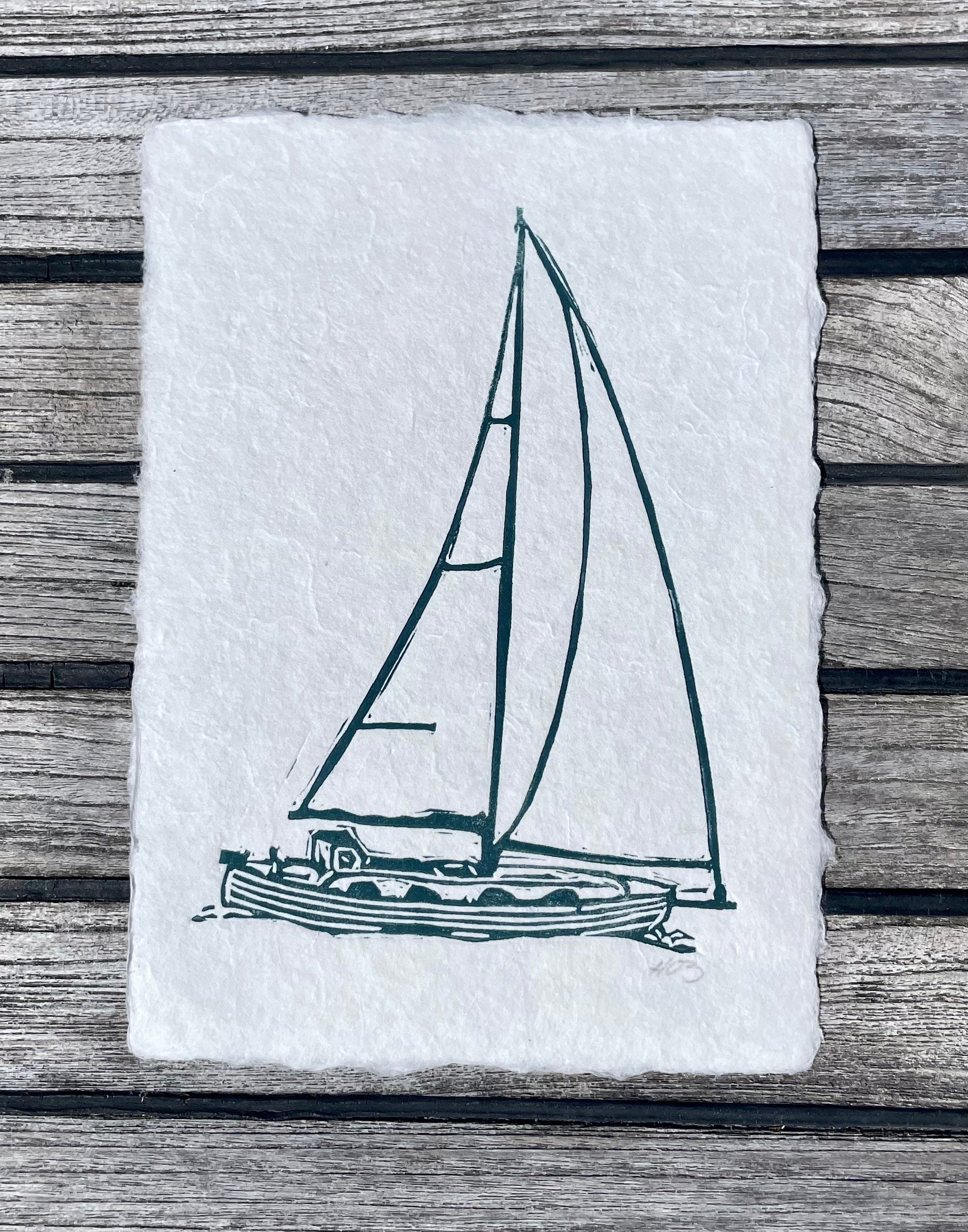 This print is of a Hans Christian sailboat, it was designed, carved and printed entirely by hand (by me!).