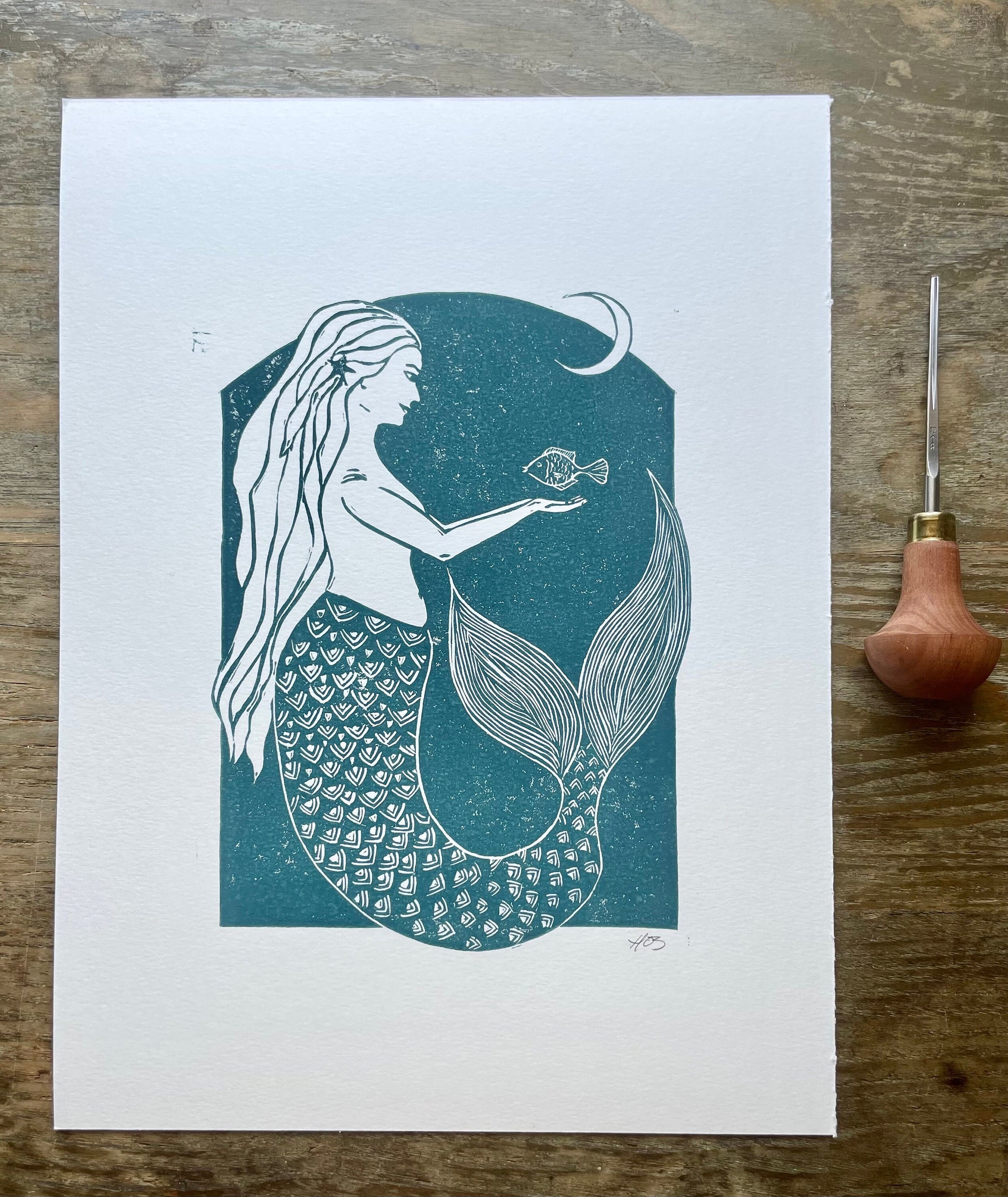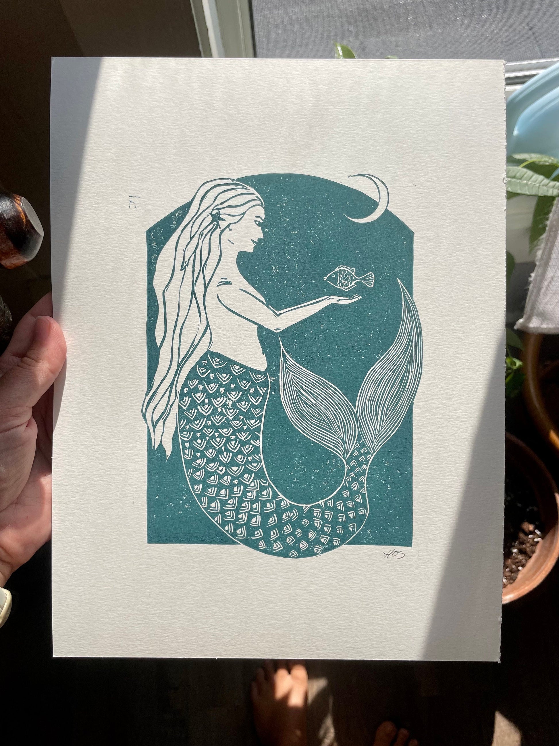 The Mermaid Print is an original design made fully by hand (by me!). I sketched and then carved this image out of a linoleum block, and then hand printed it on heavyweight paper.