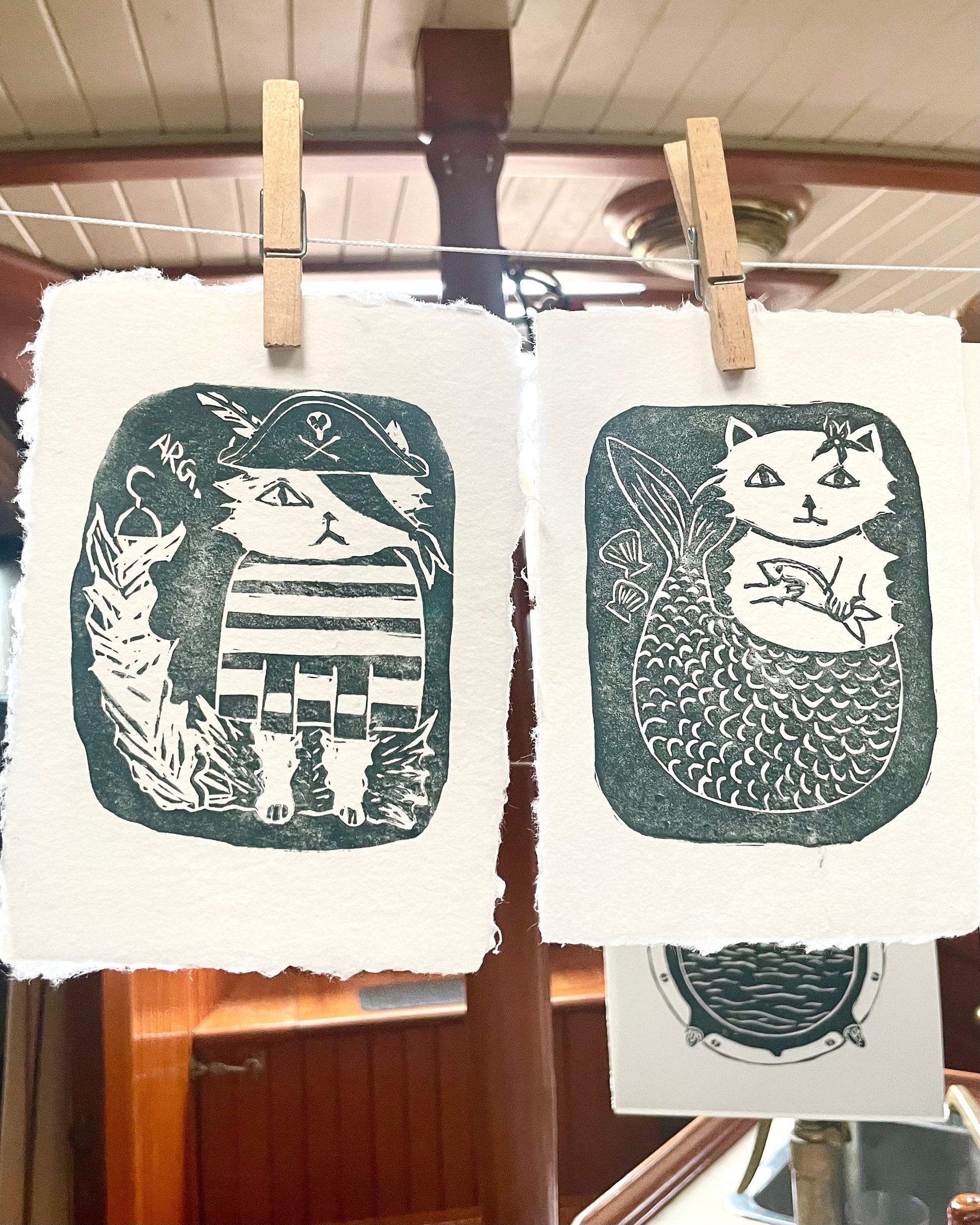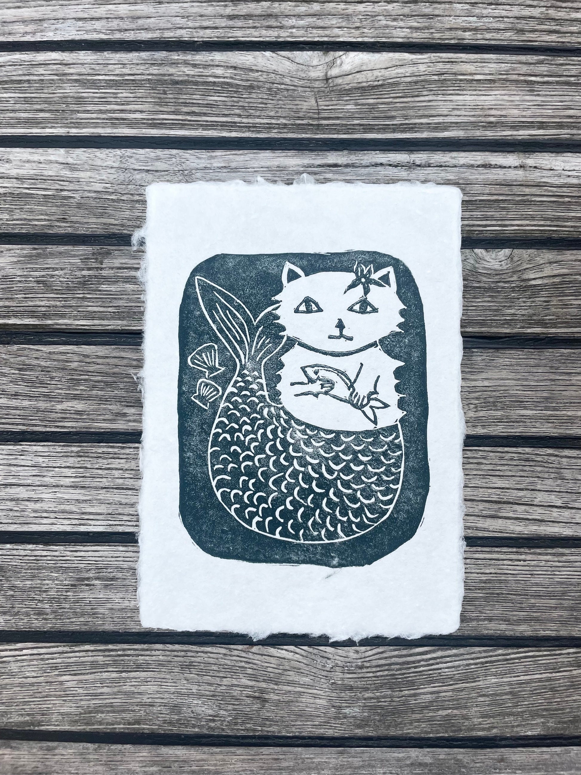 Roger the mermaid cat!! This print is inspired by my cat (Roger). It is an original design, hand printed by me. The dimensions are roughly 5x7, but the paper is also handmade so the sizing varies (only slightly). This fun print is the perfect addition to your home, whether you’re a cat lover, a mermaid lover, or just enjoy humorous beautiful art. Because I print everything by hand there may be slight differences between each print, and that is part of the beauty of printmaking!