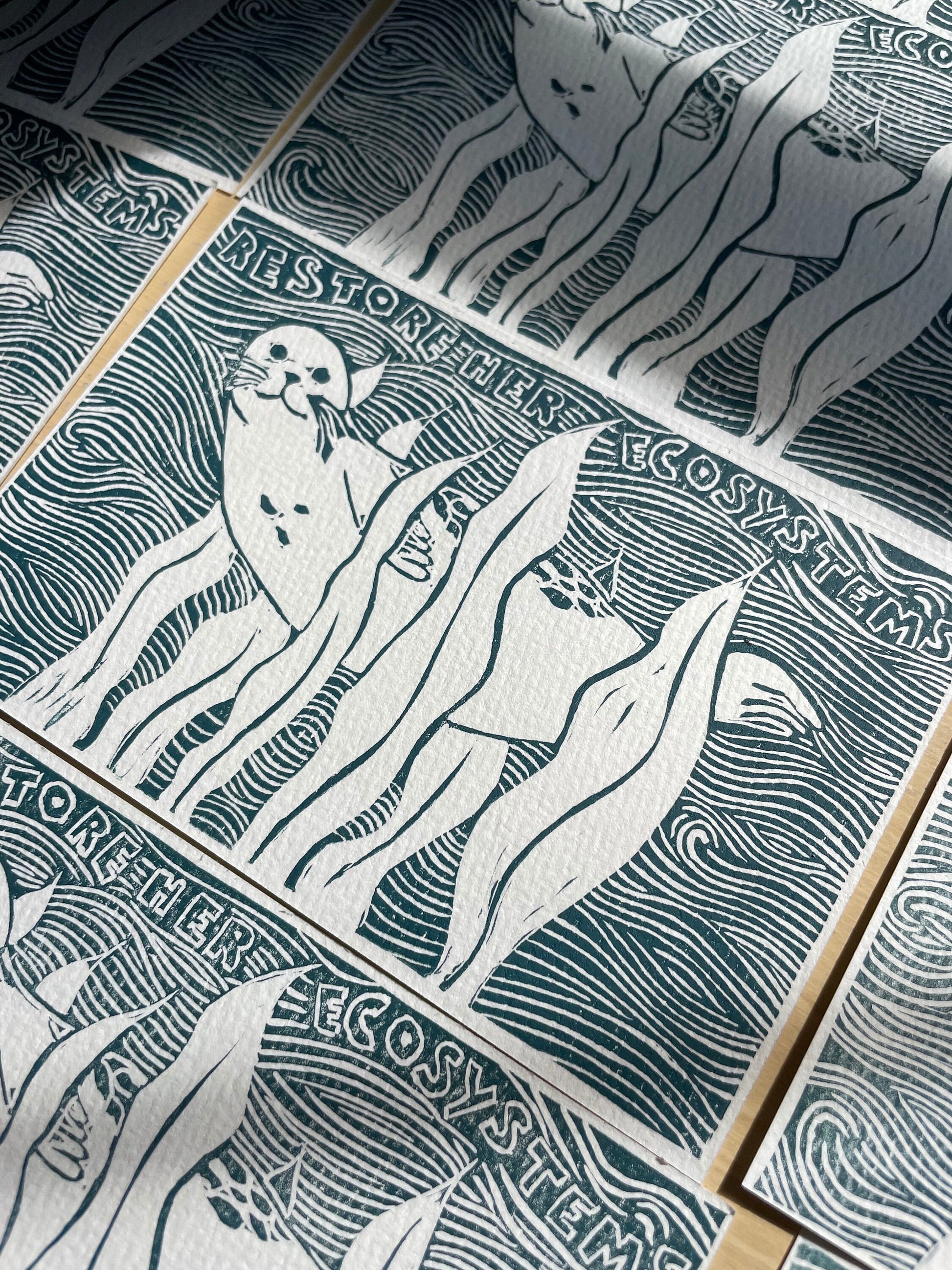 4x6 postcard, hand printed, original design! You can receive a hand printed postcard each month by subscribing on patreon!
