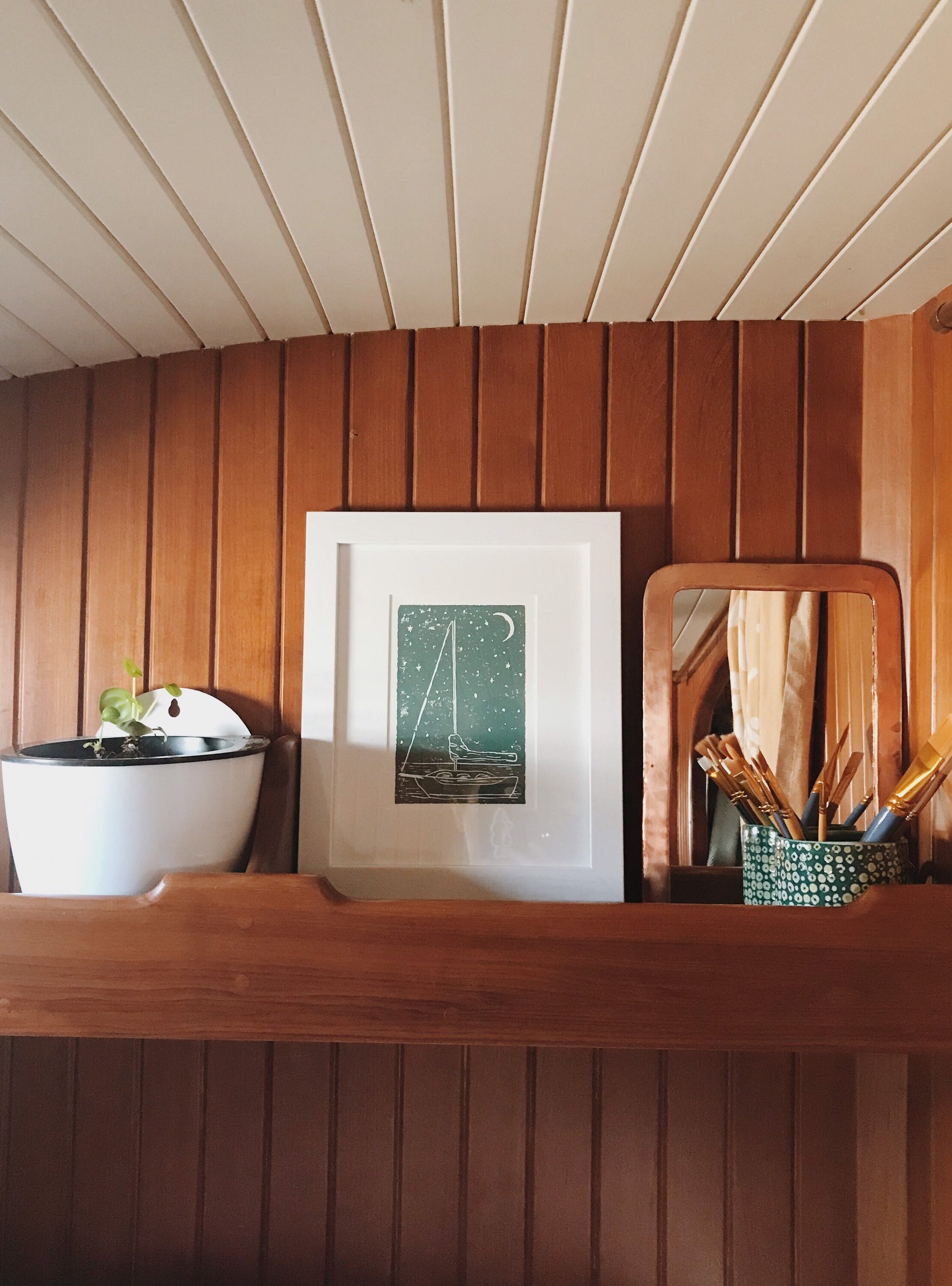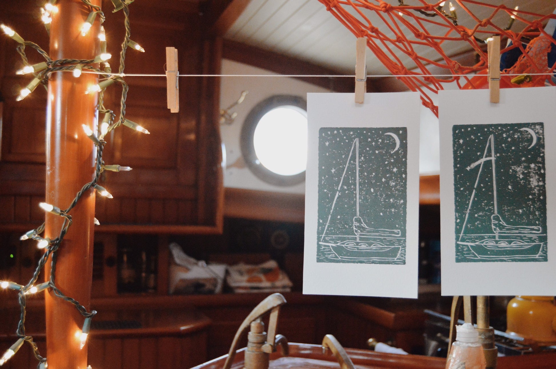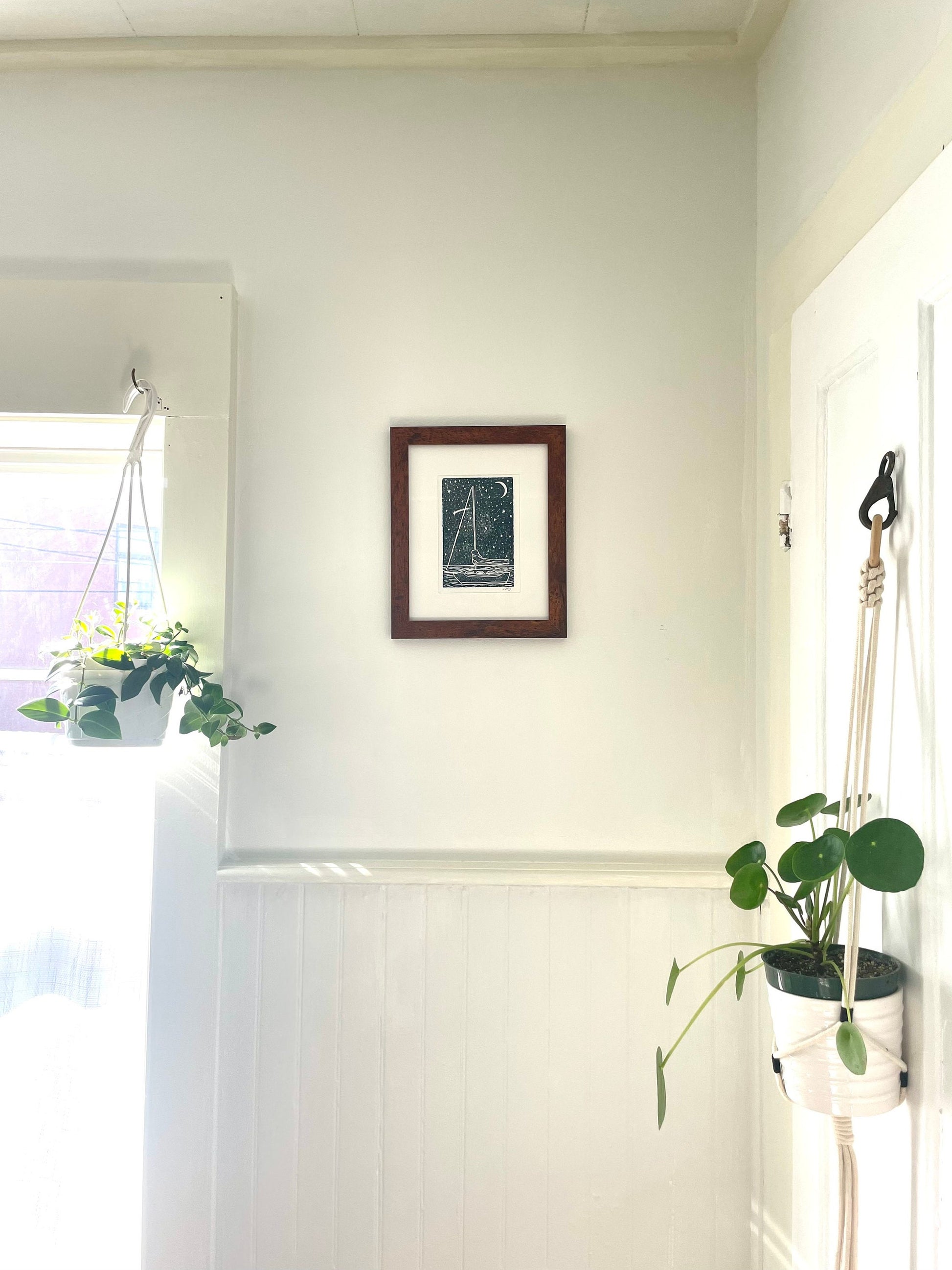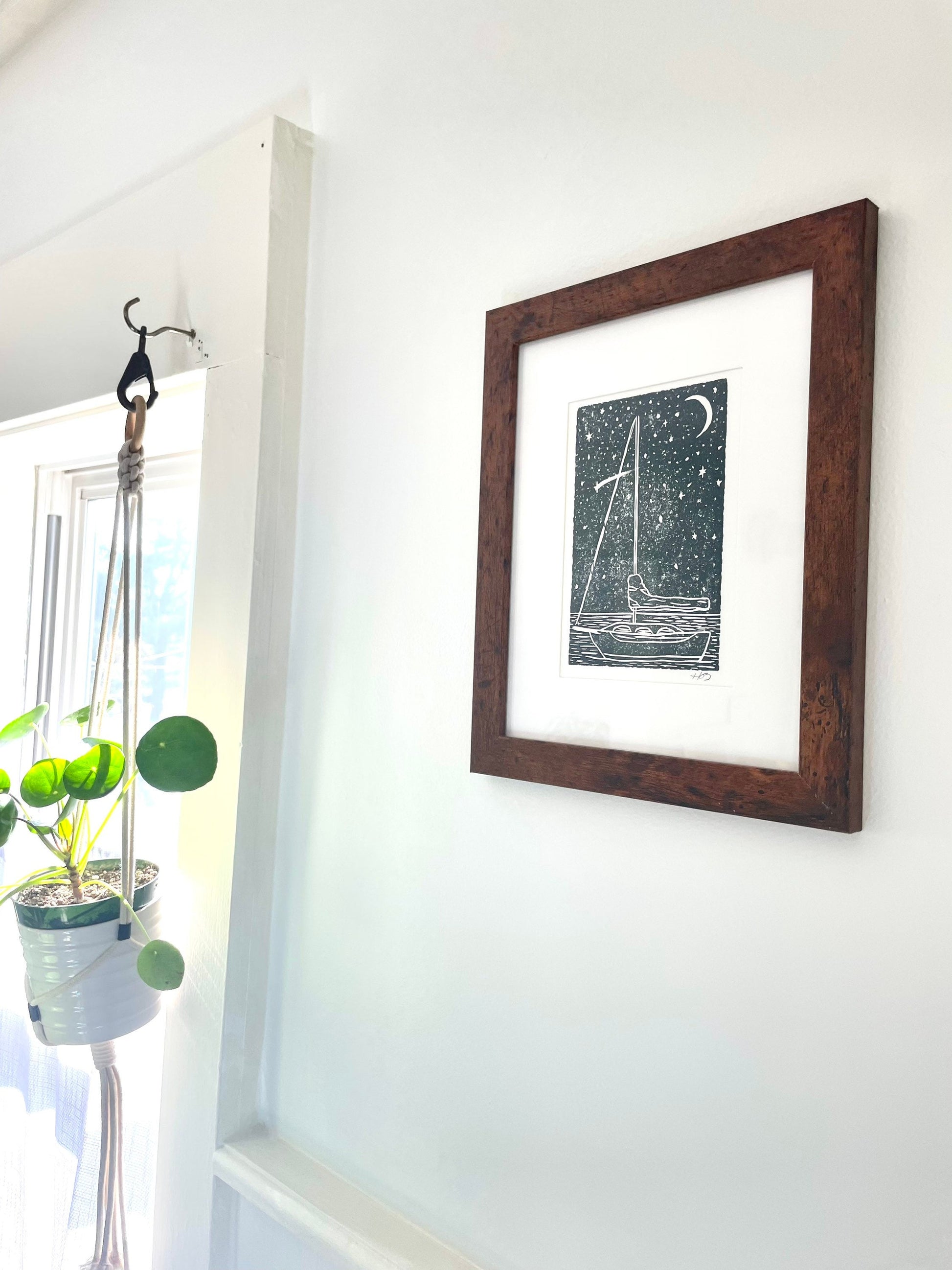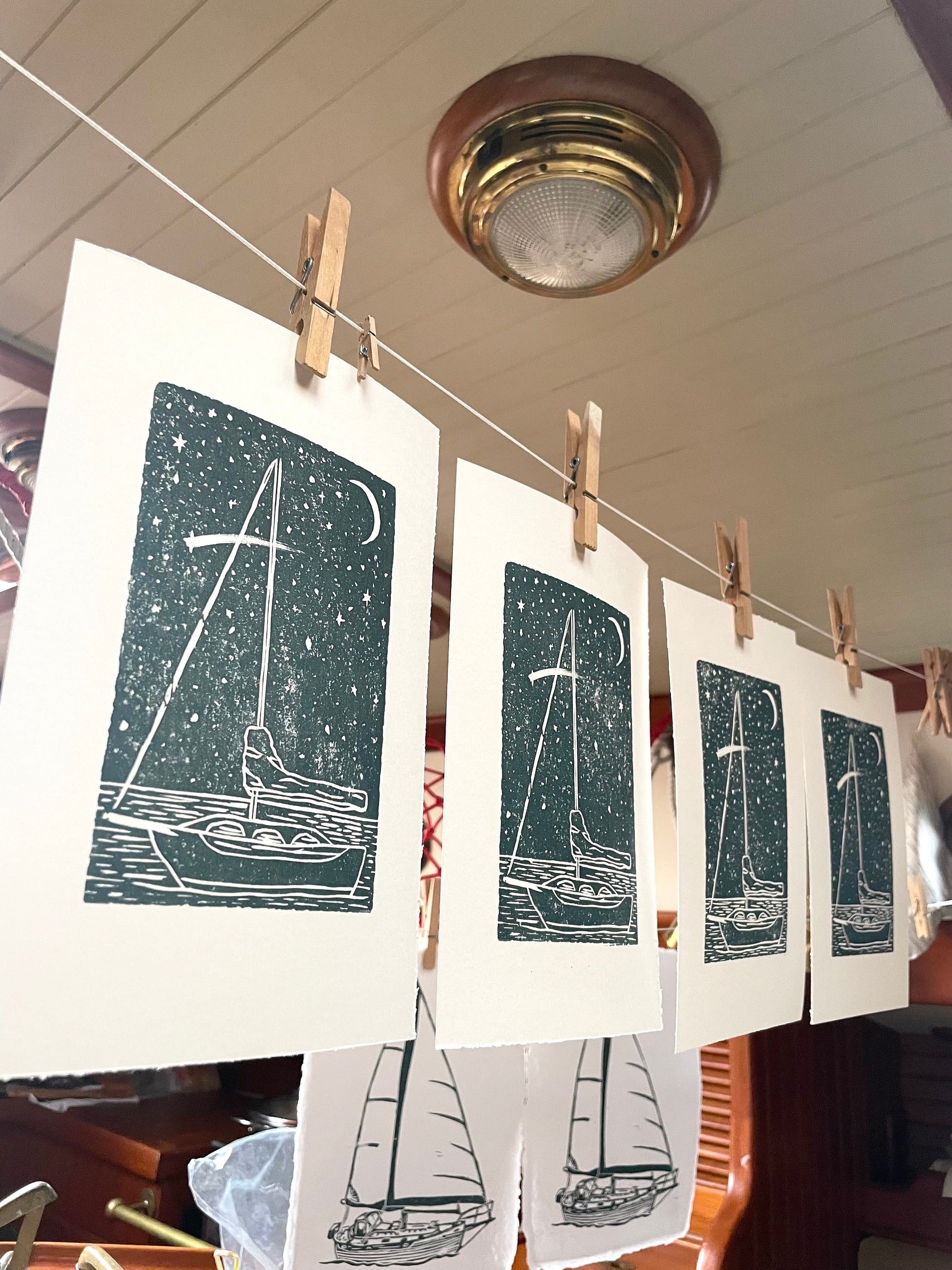This sailboat under the stars print is for anyone inspired by the sea! I sketched and then carved this image out of a linoleum block, and then hand printed it on heavyweight paper.