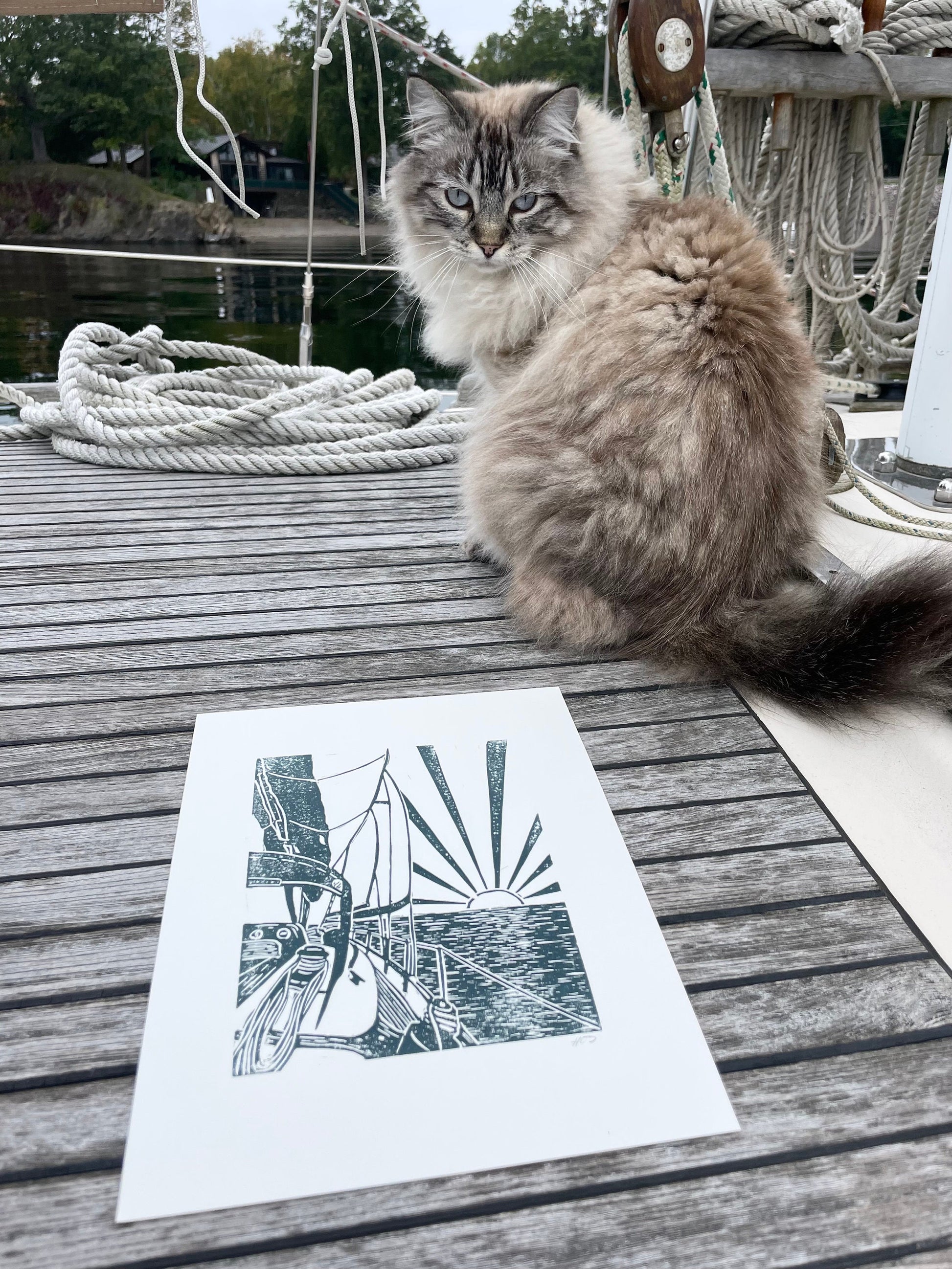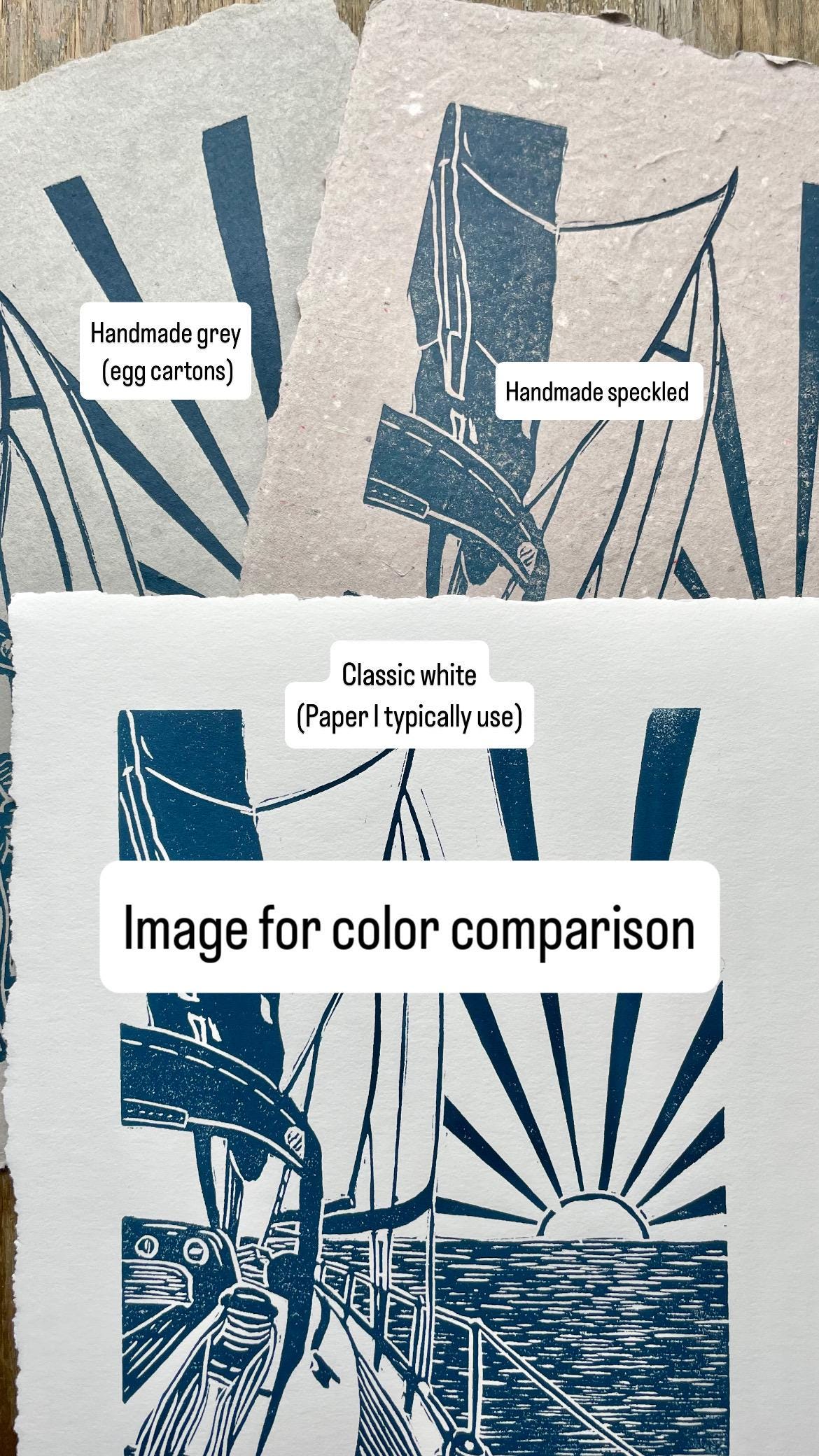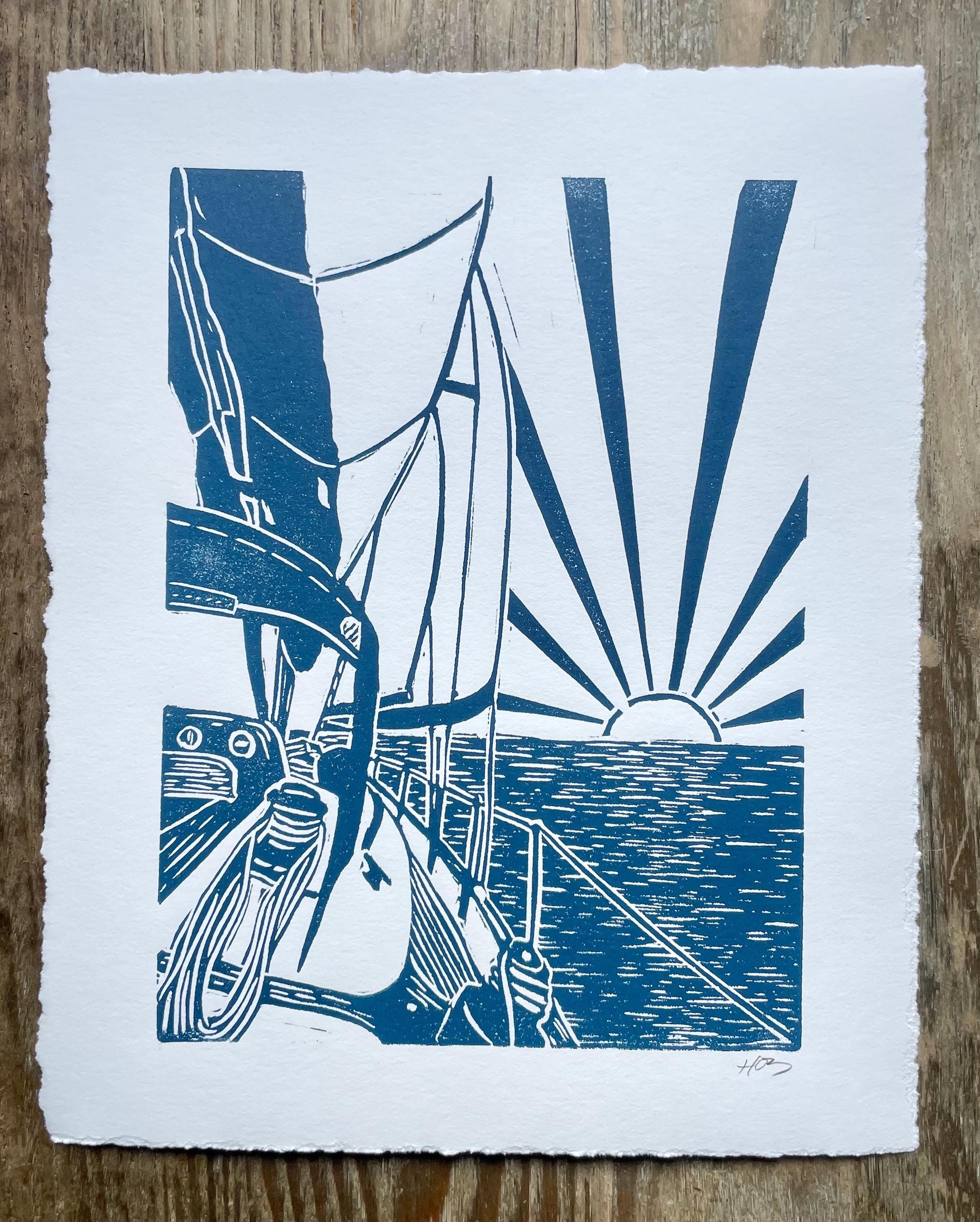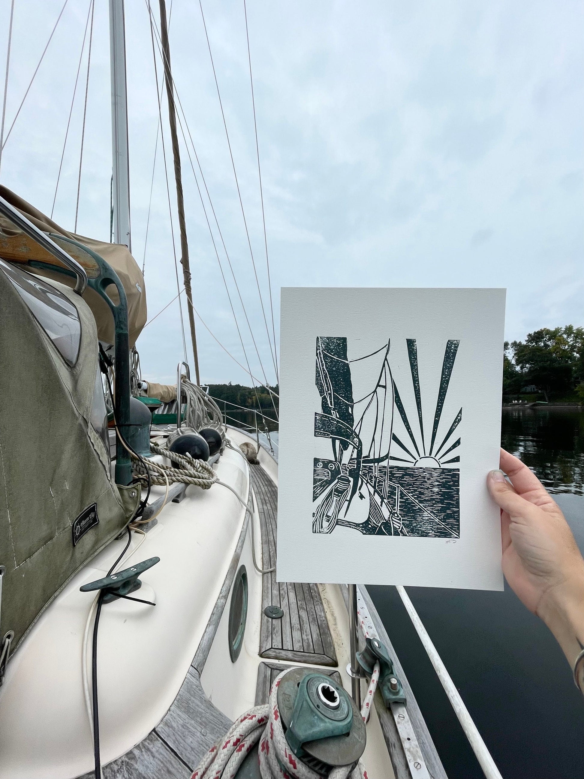 This sailboat print is an original design made fully by hand (by me!). I sketched and then carved this image out of a linoleum block, and then hand printed it on heavyweight paper.