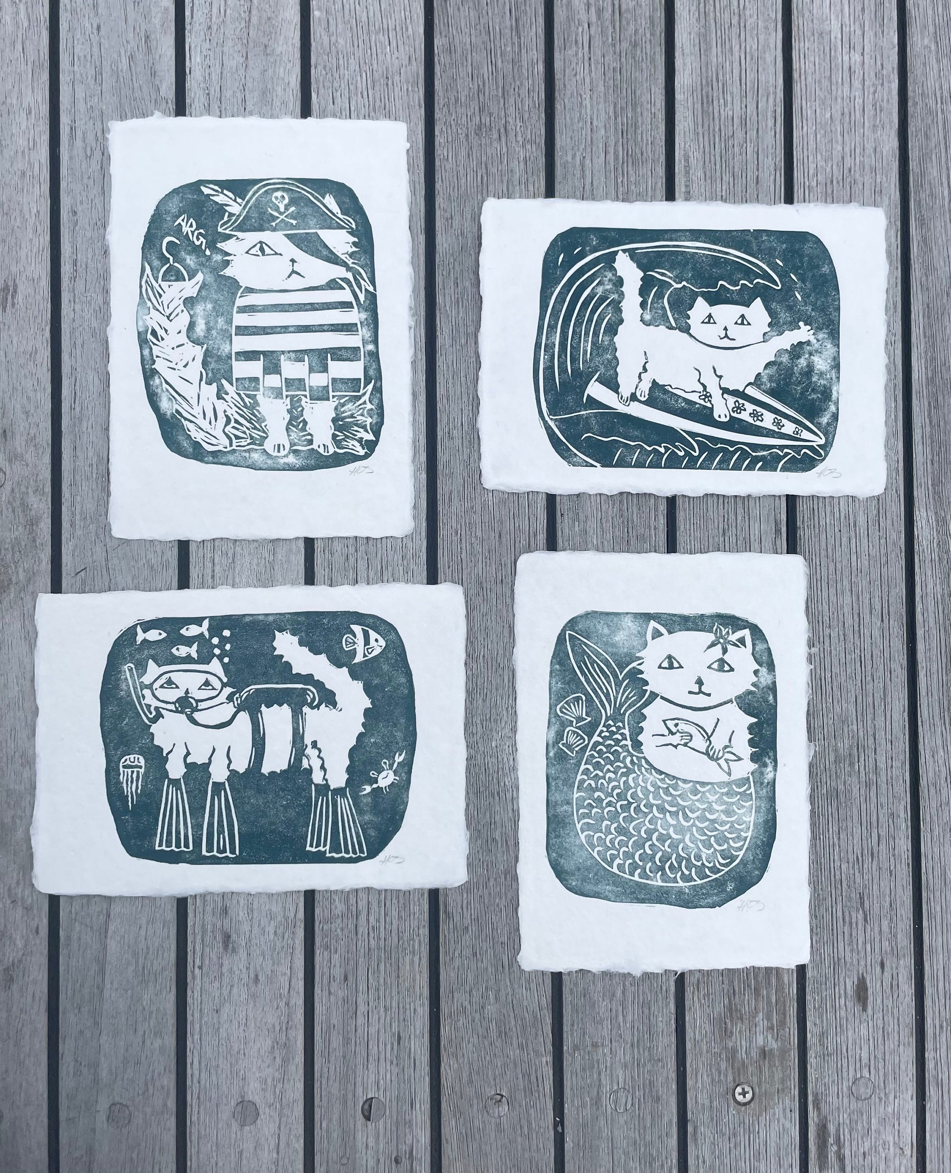 The adventures of Jolly Roger continues with Scuba!! This print is inspired by my cat (Roger). It is an original design, hand printed by me. The dimensions are roughly 5x7, but the paper is also handmade so the sizing varies (only slightly). This fun print is the perfect addition to your home, whether you’re a cat lover, a diver, or just enjoy humorous beautiful art. Because I print everything by hand there may be slight differences between each print, and that is part of the beauty of printmaking!
